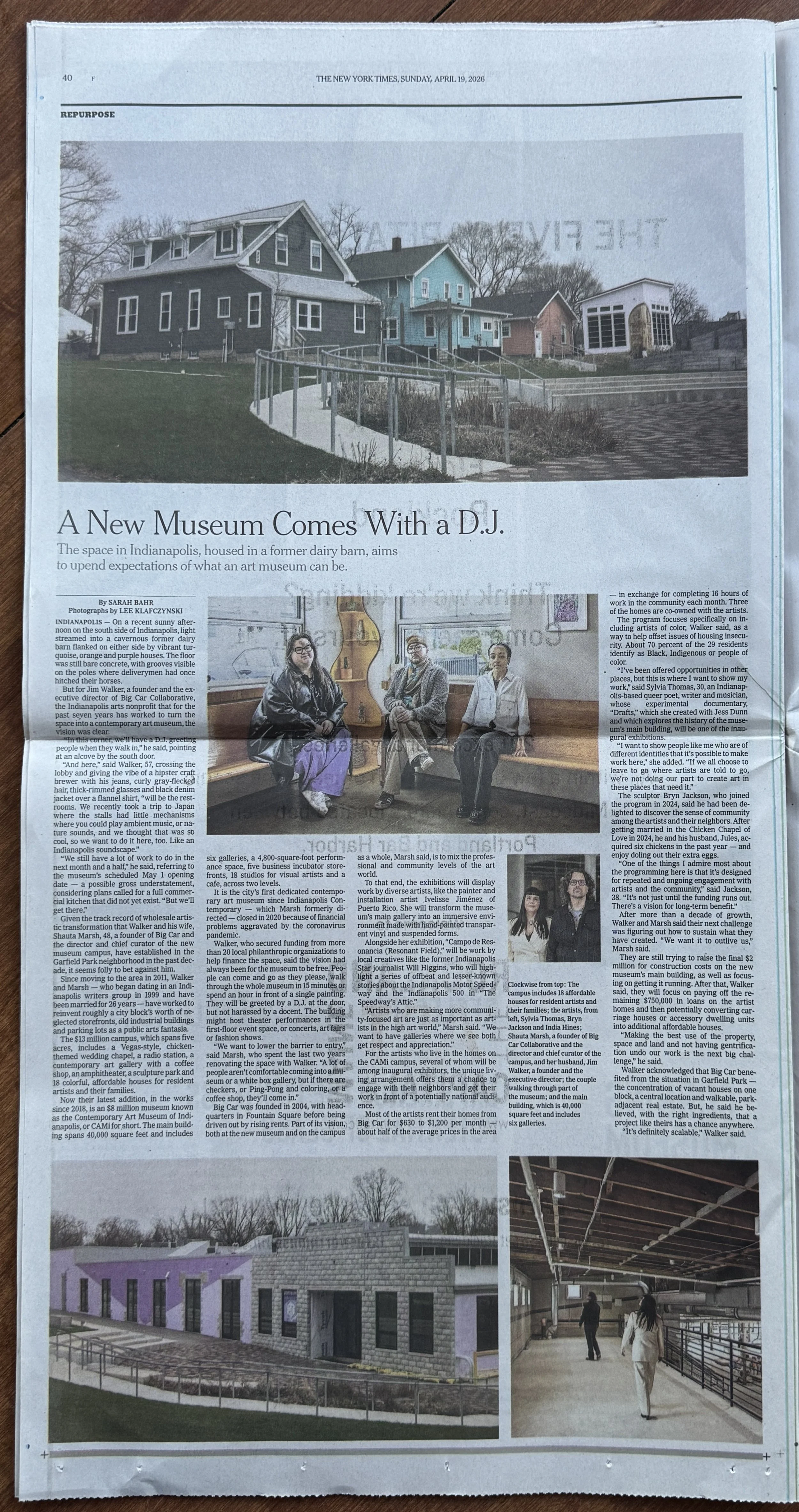 Our CAMi expansion received full-page coverage in The New York Times, with an excellent story by Sarah Bahr published in its annual museum section in the Sunday edition on April 19, 2026. Read the story here: In Indianapolis, a New Contemporary Art Museum Comes With a D.J.